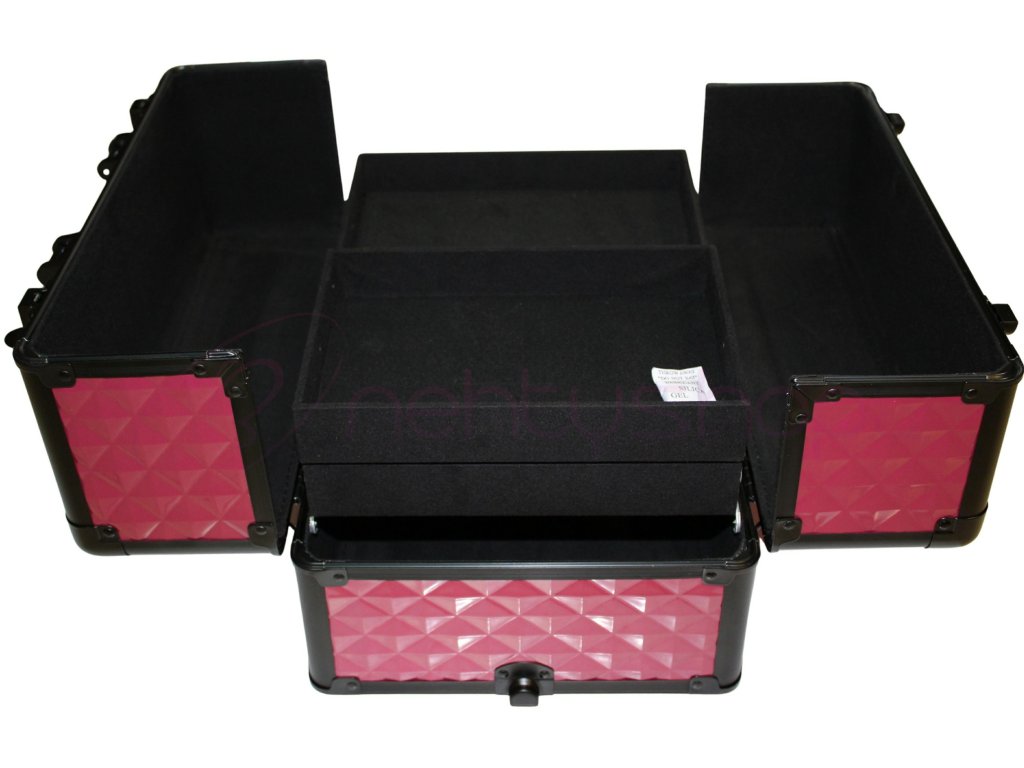 Vnitřní prostor je vystlán měkkým velurovým materiálem, jenž chrání obsah před poškrábáním, nárazy a nečistotami. Praktické výsuvné přihrádky umožňují rychlý přístup k drobnému příslušenství, zatímco prostorná hlavní komora bez problémů pojme UV /LED lampu, profesionální stolní brusku nebo jiné objemnější přístroje. Jednou z největších výhod je možnost rozložení kufru na dva samostatně použitelné díly.