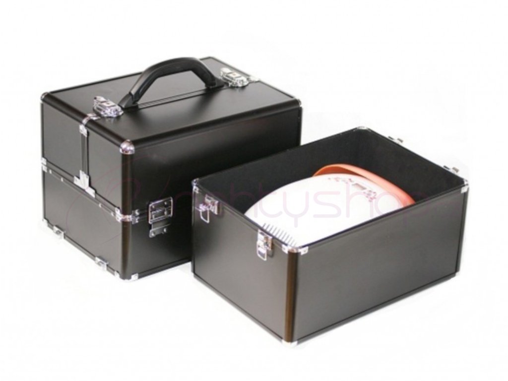 Praktický dvojitý kosmetický kufřík z lehkého pevného materiálu (hliníku), zesílené rohy proti poničení, vnitřní povrch je potažen sametovou látkou.Kufřík má dvě posuvné zásuvky a je uzamykatelný. Ve spodní části je dostatek místa pro uložení LCD lampy, brusky, mnoho gelů a jiného příslušenství. Ideální na cesty.