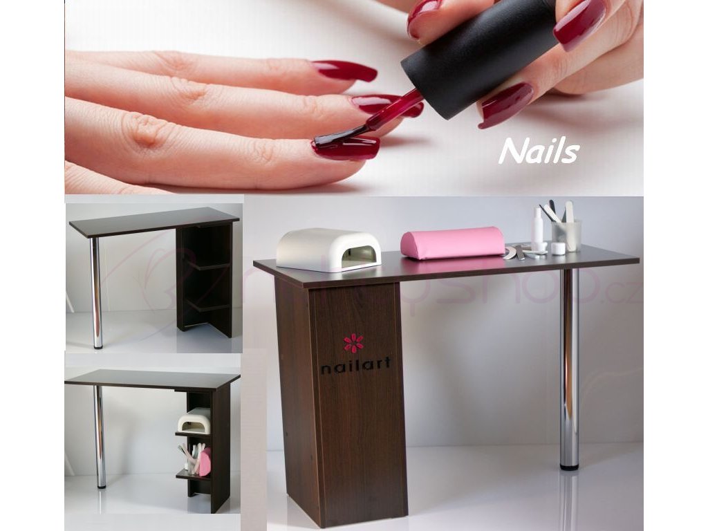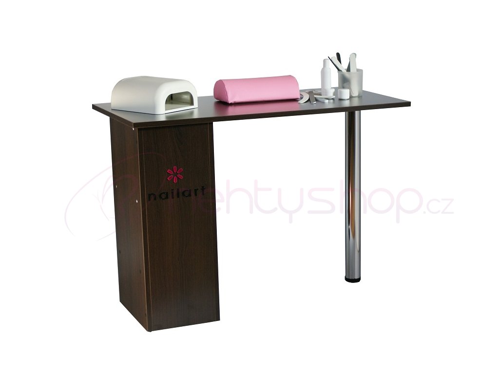 Hnědý kosmetický stolek vhodný pro domácí manikúru. Snadné čištění a údržba. Materiál je dřevotříska.