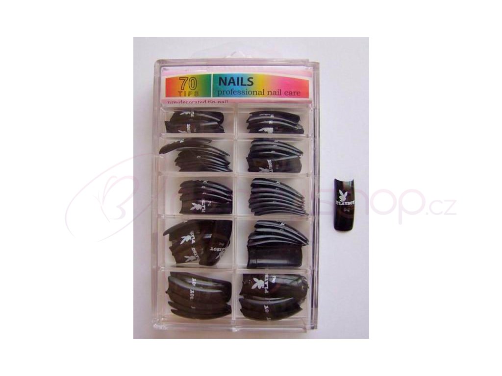 tipy na modeláž nehtů, černé tipy s potiskem králíčka PLAYBOE, 70 ks + box, velikost 1-10, vždy po 7 kusech, s krátkou nalepovací plochou